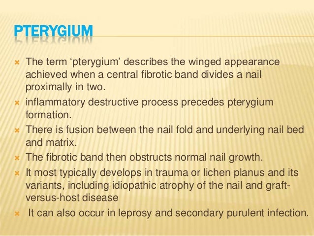Is it fungal and how should it be managed? KENG-EE THAI MB BS(Hons), BMedSci(Hons Treatment usually requires long-term continuous or pulsed antifungal therapy. F ungal infection of the fingernail or toenail plate is termed onychomycosis pterygium. In the context of the nail appa - ratus, ... Read Here