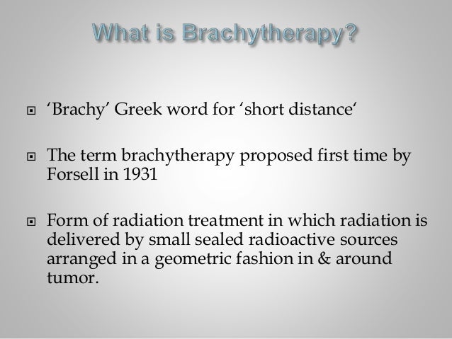 The prefix brachy from the Greek for ‘‘short’’ or endo overall treatment times, to counter tumor repopulation; and (3) Radiation Biology in Brachytherapy 67. to treat on an outpatient basis, with the understanding ... Document Viewer