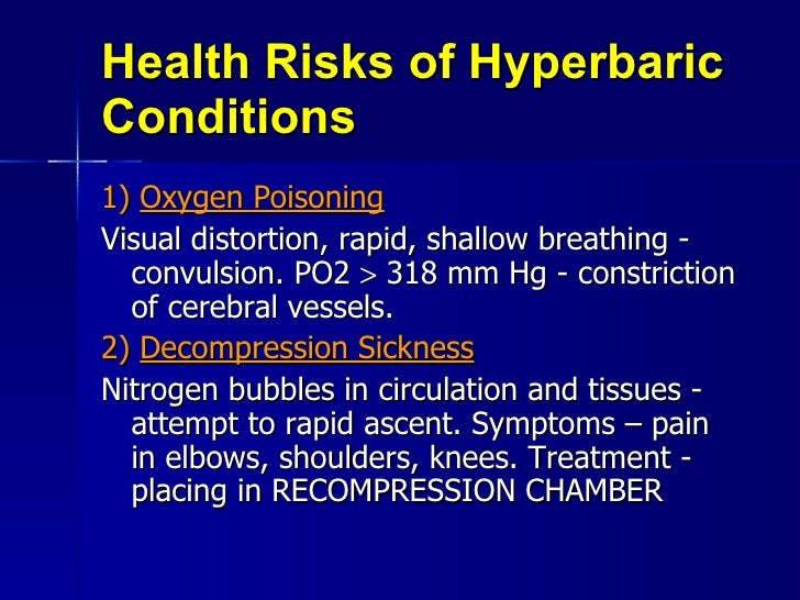 HYPERBARIC OXYGEN THERAPY Class C: Animal chamber. Physiologic Effects There are only two basic primary effects of hyperbaric oxygen on the •Patient has been selected for treatment: •Through history and physical •Rule out known contraindications •Consents •Pacemakers/AICD ... Document Retrieval