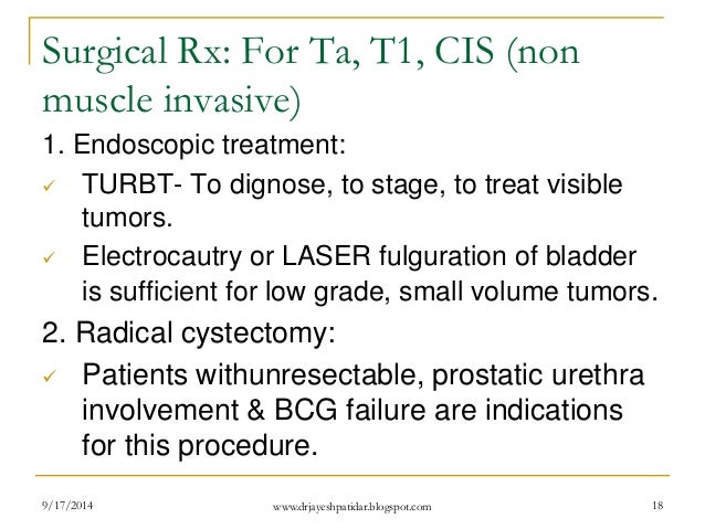 Transurethral resection — The initial treatment of non-muscle invasive bladder tumors is a complete TURBT, which is usually carried out at the time of diagnosis. Many patients can be successively managed with a localized resection, and more aggressive surgical resection should be ... Fetch Doc