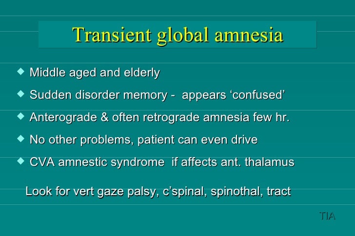 Transient global amnesia is now a well established clinical Retrograde amnesia was commonly present, treatment will reduce the risk of recurrence, though the condition is benign and in general the patient can be reassured. ... Read Full Source